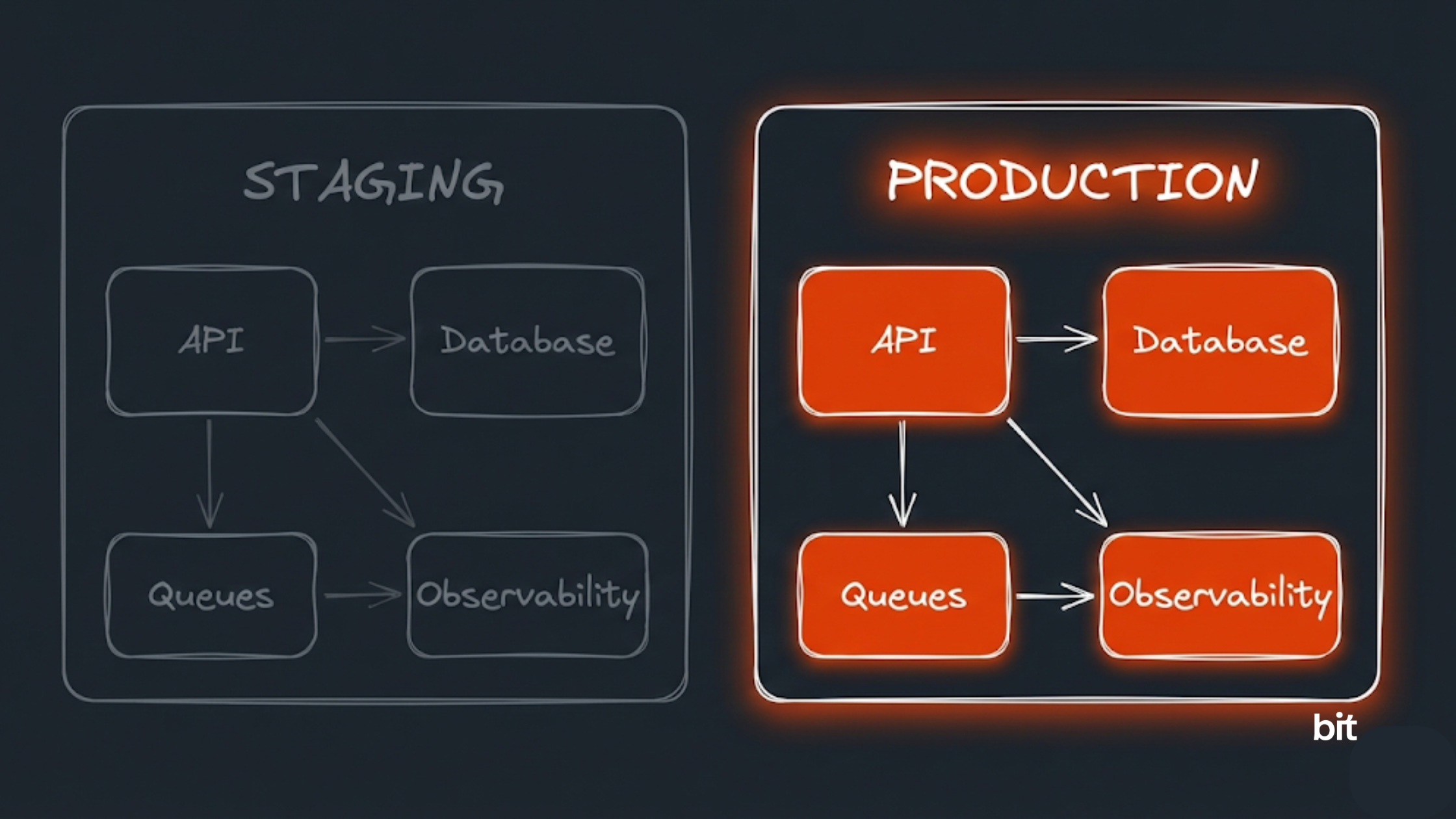 Our staging environment isn’t a playground with random settings. It’s intentionally close to production: same topology (services, queues, databases, networking), same deployment process, same observability stack.